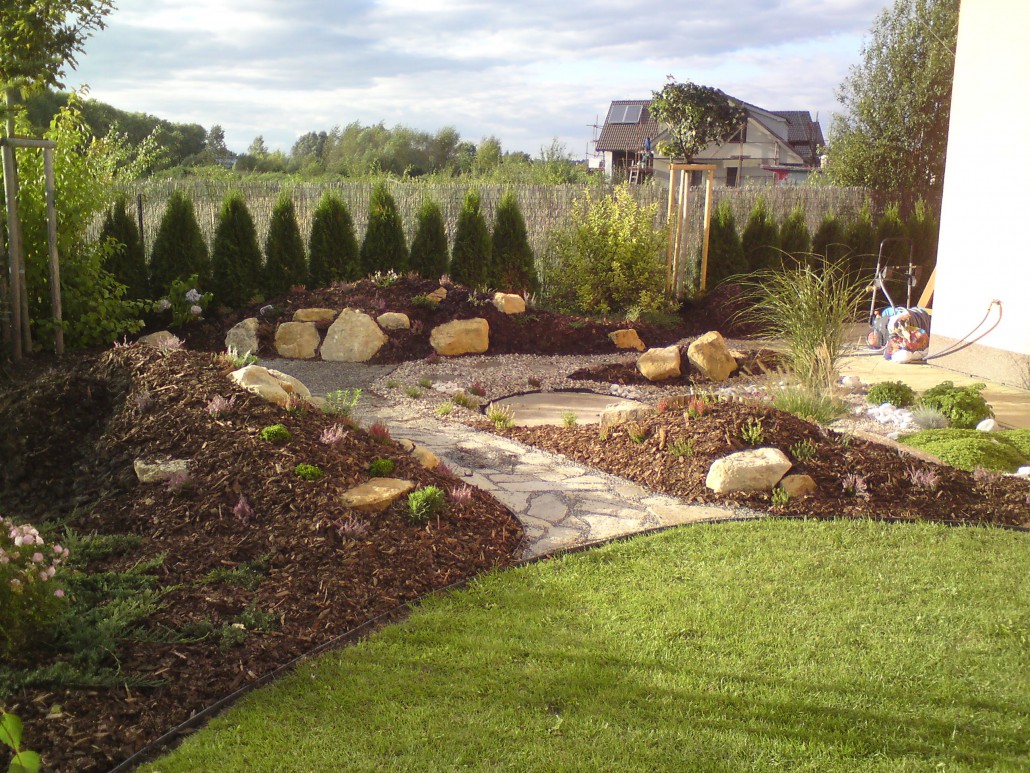 Poté se provede hrubá modelace terénu a případně se postaví opěrné zídky, cestičky apod.